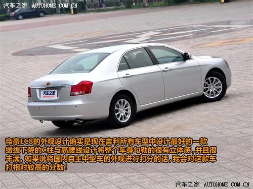 剛才說完了我對這款車的第一印象,下面我再和你說說我的第二印象:漂亮。請不要認為我是帝豪的車托,因此當你見到帝豪EC8的時候也會對這款車的優(yōu)美的外形設計感到贊嘆。特別是從尾部以45°角看的時候更會讓你覺得它的線條很優(yōu)美。此外,帝豪EC8的C柱設計的特別厚實且平緩,這樣就與后備箱很好的融合在一起。