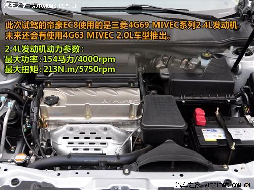 此次試駕的帝豪EC8車(chē)型全稱(chēng)為EC825,采用的是三菱2.4L 4G69發(fā)動(dòng)機(jī),這臺(tái)發(fā)動(dòng)機(jī)可是有歷史念頭了,國(guó)內(nèi)很多廠家都在使用這臺(tái)發(fā)動(dòng)機(jī)作為自己的動(dòng)力單元。而帝豪EC8使用的這臺(tái)發(fā)動(dòng)機(jī)則是原裝進(jìn)口的4G69 MIVEC發(fā)動(dòng)機(jī),雖然從數(shù)據(jù)上看并么有什么亮點(diǎn),但是發(fā)動(dòng)機(jī)本身質(zhì)量比較過(guò)硬,同時(shí)在油耗方面比較控制的相對(duì)較好。