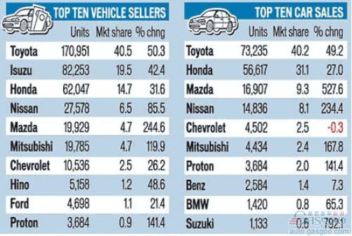 下表為今年前7個(gè)月泰國(guó)市場(chǎng)各車(chē)企汽車(chē)和轎車(chē)銷(xiāo)量排行榜: