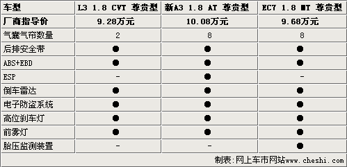 另外,奇瑞新A3全系都標(biāo)配了ESP電子穩(wěn)定系統(tǒng),緊急情況下可以大大提高整車的安全性,在主動(dòng)安全方面更加優(yōu)秀。另外,帝豪EC7系列車型都配備了胎壓監(jiān)測(cè)裝置,這種配置在炎炎夏日或者出游的時(shí)候非常實(shí)用。相對(duì)而言,比亞迪L3雖然是全新車型,但在安全配置方面確實(shí)沒(méi)有太多亮點(diǎn)可言。