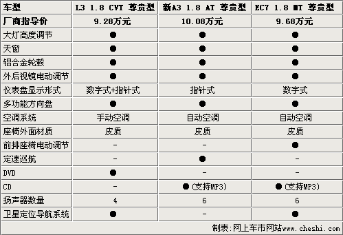 奇瑞新A3和帝豪EC7都采用自動(dòng)空調(diào),而比亞迪L3卻依然采用手動(dòng)機(jī)械式空調(diào),相對(duì)而言有些落伍。奇瑞新A3雖然配備了定速巡航系統(tǒng),在高速駕駛中可以帶來(lái)更多的舒適性,但個(gè)人認(rèn)為也帶來(lái)一定的安全隱患。比亞迪L3配備了DVD系統(tǒng),和帝豪EC7一樣都配備了GPS導(dǎo)航功能。奇瑞新A3配備支持MP3、WMA音頻格式的CD音響,與帝豪EC7一樣都配備6聲道音響系統(tǒng),比比亞迪L3的音響效果應(yīng)該更出色。