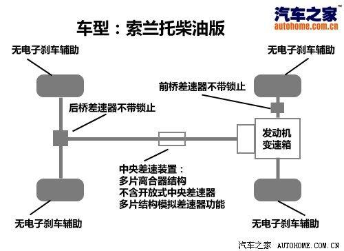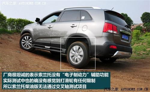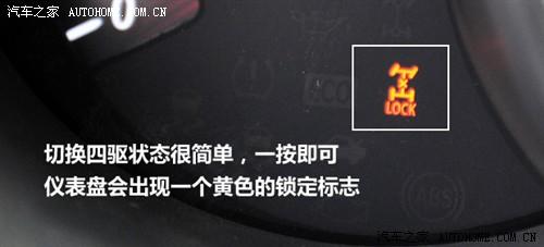 按動中控臺上的四驅(qū)按鍵即可切換至四驅(qū)模式,索蘭托采用中央多片離合器的四驅(qū)結(jié)構(gòu),前后橋差速器均不帶有鎖止功能,并且沒有電子制動輔助,因此想通過交叉軸是不可能的,所以在進行淺度越野時應(yīng)該優(yōu)化路線避免出現(xiàn)交叉軸的情況。