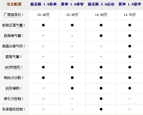 在安全配置方面,兩車的入門版車型基本保持在同一水平,正副駕駛雙安全氣囊和ABS+EBD也是目前主流的入門車型安全配置。而在較高配車型上,?怂乖谥鲃影踩嫌幸欢▋(yōu)勢,其運動版車型擁有牽引力控制和電子穩(wěn)定程序。翼神則在被動安全性上出色一些,側(cè)面頭部氣簾僅出現(xiàn)在福克斯三廂豪華型上,而全系標配的膝部氣囊在福克斯的全系都沒有配備。