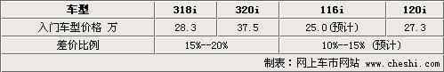 其實BMW針對相同引擎進行功率扭矩的不同調(diào)教也是有先例的,目前國內(nèi)銷售的318i和320i就屬于相同引擎排量的不同動力調(diào)教,巧合的是這兩款3系所使用的也是1系120i的這款4缸自然進氣引擎。從價位上來說3系的318i和320i之間的定價差距在15%--20%左右,那么未來BMW若引進1系的116i車款,其官方定價同樣會比現(xiàn)在的120i更低。根據(jù)BMW 針對318i和320i的定價差異,116i與120i的定價差距大致會在10%--15%之間,也就是25萬元左右。
