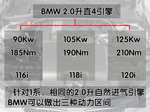 在歐洲市場BMW旗下的1系轎車在2.0升排量這個級別內(nèi),擁有3款細分車型,分別是116、118和120。而其他排量的車型還包括130以及120的柴油車款,目前中國市場所銷售的1系為120和130兩個款式。很難想象一款2.0升級別的自然進氣引擎被BMW弄出了那么多種“花樣”,在歐洲市場就有從90千瓦/185牛米、105千瓦/190牛米到125千瓦210牛米的3種車款。其中90千瓦/185牛米的入門車款被命名為116i屬于BMW 1系當中價位最低的車款。