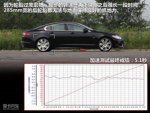 當(dāng)進(jìn)行加速測試時,按慣例我們會阻止所有電子系統(tǒng)介入,將轉(zhuǎn)速維持在發(fā)動機(jī)最佳發(fā)力區(qū),在起步的瞬間使輪胎處于滑與不滑的臨界點,之后全力沖刺。不過很抱歉,經(jīng)過多次嘗試,我們無法令XFR獲得最佳的起跑狀態(tài),原因就是因為輪胎過度磨損,起步的轉(zhuǎn)速一再下降,而順利起步之后很長一段時間,285mm寬的后輪胎都無法與地面保持良好的抓地力。通過加速曲線圖也可以看出,起步后接近1秒的時間,加速度都不高,有時還處于下降狀態(tài),最終5.1秒的加速成績并不是XFR的最強(qiáng)能力。
