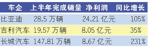 受益于上半年車市的產(chǎn)銷兩旺,三大車企的業(yè)績?nèi)飄紅,其中長城汽車取代比亞迪成為業(yè)績增長最迅速的民營車企,吉利汽車忙于整合沃爾沃轎車業(yè)務(wù),暫時沒有突出表現(xiàn)。