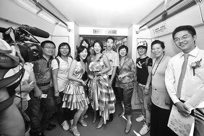 8月28日,北京,一對新人一改平常的婚車車隊接親,以騎自行車,換城鐵、地鐵的方式到達婚禮現(xiàn)場,舉辦了一個綠色、時尚的婚禮。