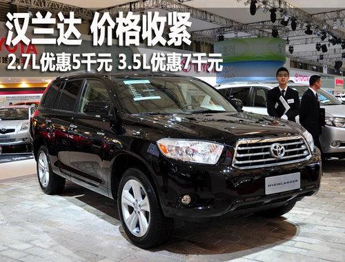 廣汽豐田生產(chǎn)的漢蘭達(dá)Highlander于2009年5月25日正式下線(xiàn),擁有2.7L和3.5L兩個(gè)排量共10款車(chē)型,價(jià)格區(qū)間為24.88~42.98萬(wàn)元。近期,編輯從北京廣汽豐田4S專(zhuān)營(yíng)店獲悉,漢蘭達(dá)現(xiàn)車(chē)充足,優(yōu)惠幅度有所縮水,現(xiàn)金讓利最高7千元。詳情見(jiàn)下表: