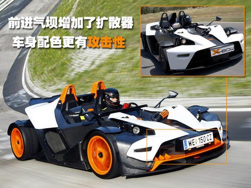 KTM將提供兩套不同的選裝套件,分別為運(yùn)動(dòng)套裝和競(jìng)速套裝給不同的客戶。每個(gè)套裝都包含一套全新開(kāi)發(fā)的組件,使得不通路況和駕駛都能將性能充分發(fā)揮。而套裝的每個(gè)單一組件也都可以加裝至KTM x-bow的其它款型上,以滿足目前所有KTM用戶的個(gè)性化需求。新款車型前進(jìn)氣壩改進(jìn)了造型,增加了擴(kuò)散器,梳理氣流為前剎車機(jī)構(gòu)降溫,能夠看到明顯與老款不同,透出一種殺氣。
