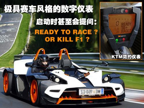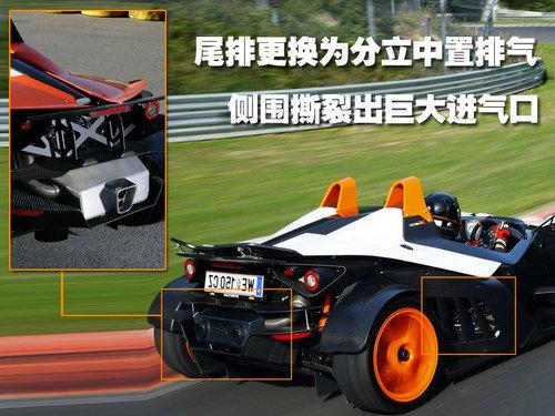 R版本經(jīng)過(guò)對(duì)引擎位置的重新設(shè)定,導(dǎo)致整車有著更低的重心,這樣使得它擁有更高的過(guò)彎速度,更加貼地的車身和更精準(zhǔn)的駕駛精度。老款KTM X-BOW車重700公斤 0-160公里每小時(shí)提速時(shí)間僅僅為3.9秒。F1賽車可以在2.5秒內(nèi)從0加速到100公里每小時(shí)。算起來(lái),X-BOW R更輕的車身,更強(qiáng)大的引擎輸出,想超越F1賽車,并不是件難事。
