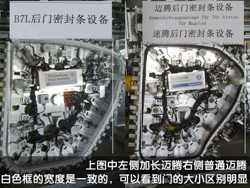 在一汽大眾位于長春的二廠生產(chǎn)線上記者也確實(shí)看到了寫有“B7L”字樣的車門試裝區(qū)域。從車門的“夾具”來看,普通的邁騰(B6)與加長后的邁騰(B7L),在門的大小上有非常明顯的區(qū)別,并且我們從工作人員那里也獲得了B7L是加長邁騰的肯定答案。