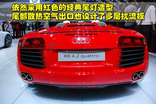 奧迪R8 4.2L敞篷版的尾部配備了自動(dòng)升級(jí)的碳纖維材質(zhì)擾流板,可以進(jìn)一步減輕車身自重。這款新車的尾部依然采用紅色的經(jīng)典尾燈造型,而且尾部的散熱空氣出口也設(shè)計(jì)了多層擾流板。奧迪R8 4.2L敞篷版尾部采用左右對(duì)稱的4排氣管設(shè)計(jì),后保險(xiǎn)杠也采用了擾流唇的設(shè)計(jì)。