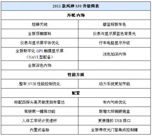 新車看點(diǎn):2011款風(fēng)神S30只是做了一些簡單的改變和升級,售價(jià)并沒有增加,另外改進(jìn)了一些老款車型上出現(xiàn)的瑕疵。