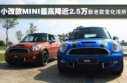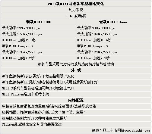 2011款MINI并非全新?lián)Q代車型,為中期改款。主要的配置變化體現在外形設計、動力系統(tǒng)以及內飾三大方面。售價22.5萬元的MINI ONE與老款的MINI Cheer相比在發(fā)動機功率方面下降了16KW,而新款MINICooper s發(fā)動機功率則提升7KW換來的是快0.1秒的百公里加速時間。在配置方面,新款車型于老款車型相比略有提升,但是并不明顯,主要變化還是體現在設計方面 。