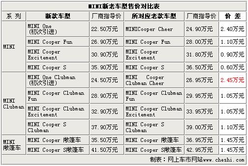 小改款的寶馬MINI全系車型于日前正式在國內上市,2011款MINI分別搭載3個發(fā)動機系列One、Cooper和Cooper S的8個車型,共10款車。新車型在設計以及動力系統(tǒng)方面進行了升級,售價區(qū)間為22.5-41.5萬元與老款車型相比最高降幅接近2.5萬元。通過下面的對比解析我們一同來了解下新老款MINI在價格以及其它方面究竟有哪些主要的變化。