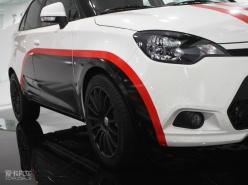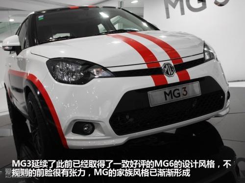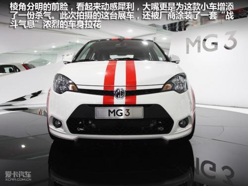 此次拍攝的這臺展車,經(jīng)過了廠家的輕度改裝。主要是“身披”了一套戰(zhàn)斗風(fēng)格非常濃烈的車身拉花,以及4個黑色的賽車競技風(fēng)格輪轂,其余部分與量產(chǎn)車型無異。外觀經(jīng)過精心改造的MG3愈顯有型,是一臺非常火辣的運動型A0級小車。從前臉可以看出,MG3與MG6風(fēng)格十分相似,顯然MG品牌已經(jīng)找到了屬于自己獨特的家族風(fēng)格。