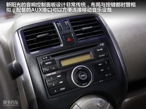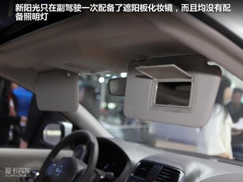新陽光的音響控制面板設(shè)計(jì)十分傳統(tǒng),布局與按鍵都與現(xiàn)在主流的日產(chǎn)車型一致,并沒有什么新鮮感。倒是圓形的自動(dòng)空調(diào)控制面板設(shè)計(jì)的非?蓯,是新陽光內(nèi)飾的一大亮點(diǎn),而且操作起來沒有任何難度。新陽光只有副駕駛位置配備了遮陽板化妝鏡,而且沒有配備照明燈,讓人有些不解。