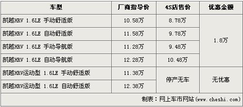 據(jù)經(jīng)銷商處銷售人員介紹,凱越HRV共有6個車型,由于運動版車型現(xiàn)已停產(chǎn),經(jīng)銷店內(nèi)已經(jīng)沒有現(xiàn)車,所以在售的車型只有舒適版和導航版共4款車型。近期購買凱越HRV的消費者可以得到1.8萬元的現(xiàn)金優(yōu)惠,經(jīng)優(yōu)惠后,入門級的1.6LE手動舒適版車型售價從廠商指導價10.58萬元跌至8.78萬元。