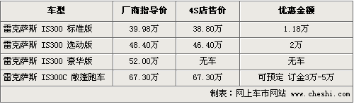 據(jù)4S店銷售人員介紹,目前雷克薩斯IS300系列有普通轎車和敞篷硬頂跑車兩個系列,其中敞篷跑車的售價已經(jīng)公布,售價為67.3萬元,各經(jīng)銷商處可以接受預訂,訂金為3萬-5萬不等,7月首批新車即可到店。據(jù)銷售人員介紹哦G-BOOK智能副駕系統(tǒng)是這款車的最大亮點。同時轎車版三款車目前只有IS300選動版現(xiàn)車供應,最高可優(yōu)惠現(xiàn)金2萬元。同時,部分經(jīng)銷商還推出了購車送一年全車保險的活動,保險金額在1萬-2萬之間。