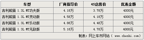 熊貓作為吉利全球鷹品牌下的代表產(chǎn)品,在去年上市后受到了眾多消費者的青睞。網(wǎng)上車市網(wǎng)站了解到,在自動檔車型上市后,在售的手動車型也將全面升級,將不受市場歡迎的負壓式后窗全面升級為電動升降后窗。而價格上沒有任何變化,經(jīng)銷商處全系仍可給出4000元優(yōu)惠。詳情如下: