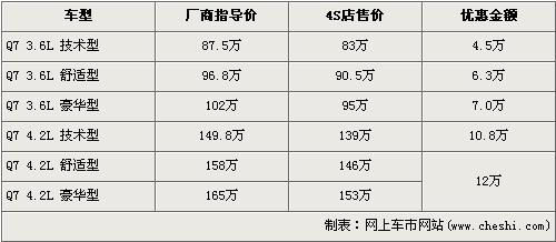 據(jù)銷售人員介紹,奧迪Q7分為3.6L和4.2L兩種排量共7款車型,目前全系最高優(yōu)惠為12萬元。3.6L車型最高優(yōu)惠7萬元,其中最低配的技術(shù)型優(yōu)惠后售價降到了83萬元,3.6L舒適型售價降到了90.5萬元,3.6L豪華型售價95萬。排量更大的4.2L車型優(yōu)惠最高更是達(dá)到了12萬元,4.2L舒適型售價降到146萬元,4.2L豪華型售價降到了153萬。