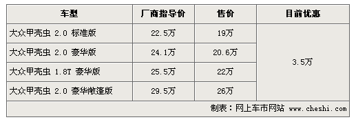據(jù)4S店銷售人員介紹:目前甲殼蟲全系可優(yōu)惠3.5萬(wàn)元,2.0標(biāo)準(zhǔn)版售價(jià)僅為19萬(wàn),但目前硬頂版甲殼蟲無(wú)現(xiàn)車,訂車需等半個(gè)月至兩個(gè)月。敞篷版目前現(xiàn)車較充足,喜歡的朋友可以不必等待漫長(zhǎng)的訂車時(shí)間。