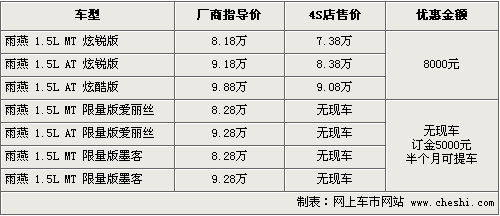 長安鈴木雨燕是小型車型中最受歡迎的一款之一,在推出限量版車型后,雨燕從整車的外觀和內(nèi)飾的風(fēng)格上更具個(gè)性化,時(shí)尚化,滿足了都市年輕80后的喜愛。根據(jù)網(wǎng)上車市價(jià)格監(jiān)測系統(tǒng)顯示,目前雨燕全系最高能優(yōu)惠現(xiàn)金8000元,限量版車型則需要預(yù)訂,具體車型以及價(jià)格如下: