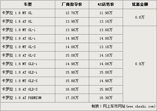 卡羅拉是一汽豐田于旗下的主力經(jīng)濟(jì)型轎車(chē),上市后憑借著時(shí)尚的外觀贏得了消費(fèi)者的喜愛(ài)?_拉全系共有5款車(chē)型,排量分為1.6L、1.8L,價(jià)格區(qū)間為13.28萬(wàn)元-17.98萬(wàn)元。前段時(shí)間,豐田官方對(duì)卡羅拉全系下調(diào)了廠商指導(dǎo)價(jià),最高下降了9000元。近日根據(jù)網(wǎng)上車(chē)市價(jià)格監(jiān)測(cè)系統(tǒng)顯示,近期在經(jīng)銷(xiāo)店購(gòu)買(mǎi)卡羅拉車(chē)型的消費(fèi)者,可以得到最高9000元的優(yōu)惠,具體詳情請(qǐng)看下表: