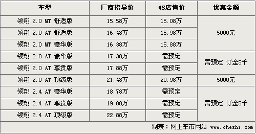 北京現(xiàn)代索納塔領翔于去年12月底正式上市銷售,為了提高領翔在同級別車型中的競爭力,在原有車型基礎上,領翔又新增了兩款車,并提高了多款車型的配置,提高了整車性價比。根據(jù)網(wǎng)上車市價格監(jiān)測系統(tǒng)顯示,目前領翔全系最高可優(yōu)惠現(xiàn)金5000元,但現(xiàn)車供應較緊張,具體行情如下: