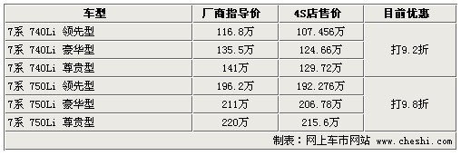 據4S店銷售人員介紹:目前新7系現車較少,大部分需要預訂。最快預定時間為2周左右,最長需等3個月以上。目前店內只有740Li領先型少量現車,,顏色有黑色及灰色。在優(yōu)惠政策方面,740Li系列可以打9.2折,750Li系列可以打9.8折,喜歡的朋友可以到店內洽談。