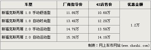福克斯自06年8月份上市以來,其憑借動(dòng)感前衛(wèi)的外形以及動(dòng)力充沛的性能配置博得了不少年輕時(shí)尚小齡青年的喜愛,使此車的銷量一直保持的比較穩(wěn)定。上個(gè)月網(wǎng)上車市為您帶來了兩廂?怂谷祪(yōu)惠1萬元的行情,近日據(jù)網(wǎng)上車市價(jià)格監(jiān)測(cè)系統(tǒng)顯示:新?怂箖蓭惮F(xiàn)金優(yōu)惠1.2萬元,具體詳情請(qǐng)看下表:
