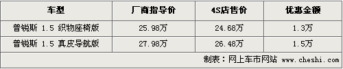 筆者從一汽豐田經(jīng)銷商處了解到,目前普銳斯銷售的車型只有兩款,分別為1.5織物版和真皮導(dǎo)航版,織物版現(xiàn)金優(yōu)惠1.3萬元,優(yōu)惠后售價為24.68萬,已經(jīng)不足25萬;真皮導(dǎo)航版優(yōu)惠現(xiàn)金1.5萬元,優(yōu)惠后售價為26.48萬。部分4S店有黑色、銀灰色等現(xiàn)貨供應(yīng),