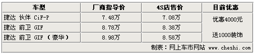 據(jù)4S店銷售人員介紹:目前捷達三款車型最高優(yōu)惠可達4000元,較之前優(yōu)惠幅度有所增加,并且捷達伙伴店內(nèi)現(xiàn)車非常充足,相比之下捷達前衛(wèi)現(xiàn)車不是非常多,顏色不是非常齊全。購捷達4S店還可送1000元裝飾,包括地膠、腳墊等最常用的裝飾。