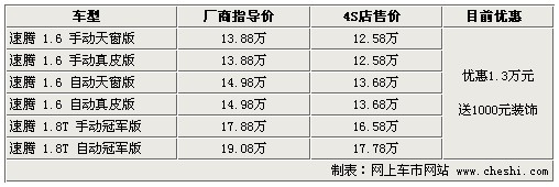 據(jù)4S店銷售人員介紹:目前速騰全系優(yōu)惠1.3萬元,較之前優(yōu)惠幅度有所增加,如在店內(nèi)做一條龍服務還可獲贈價值1000元的裝飾,裝飾主要包括腳墊、座套等。由于2.0升車型停產(chǎn),所以目前只有1.6升和1.8TSI車型。1.6升車型更注重經(jīng)濟型,而1.8TSI更加注重動力表現(xiàn)。