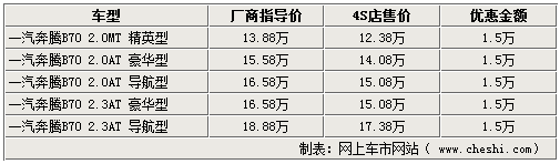 作為一汽奔騰的最新轎車車型,代號(hào)為B50的奔騰1.6L三廂新車正式上市已經(jīng)有段時(shí)間了。這款新車裝備了與速騰同款的1.6L發(fā)動(dòng)機(jī),與馬自達(dá)6睿翼采用同平臺(tái)生產(chǎn)。網(wǎng)上車市網(wǎng)站由經(jīng)銷商處得知,奔騰B50全系仍無(wú)優(yōu)惠,為預(yù)訂銷售狀態(tài),訂金1000元。而老款的B70全系車型則給出了1.5萬(wàn)元的降幅。具體詳情如下: