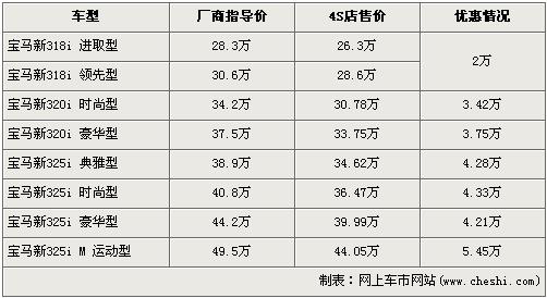 新寶馬3系在去年12月份正式在國內(nèi)市場(chǎng)正式上市銷售,經(jīng)過改款后的3系從外觀的流線,到內(nèi)飾的風(fēng)格均有一定程度的變化,帶給消費(fèi)者的是全新的視覺沖擊和駕馭樂趣。根據(jù)網(wǎng)上車市價(jià)格監(jiān)測(cè)系統(tǒng)顯示,新寶馬3系車型全系出現(xiàn)了不同的現(xiàn)金優(yōu)惠,最高優(yōu)惠達(dá)到了5.45萬元,具體車型價(jià)格如下: