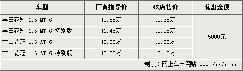國(guó)產(chǎn)花冠已經(jīng)是其第九代產(chǎn)品,尤其值得稱道的是其VVT-i發(fā)動(dòng)機(jī),這是豐田國(guó)產(chǎn)車型中首款采用此發(fā)動(dòng)機(jī)的車型。國(guó)產(chǎn)后這款車的表現(xiàn)依然如日中天,成為一汽豐田的看家產(chǎn)品。根據(jù)網(wǎng)上車市價(jià)格監(jiān)測(cè)系統(tǒng)顯示,目前花冠全系車型出現(xiàn)了5000元的優(yōu)惠幅度,具體車型以及優(yōu)惠如下: