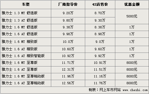 據(jù)4S店銷售人員介紹,目前雅力士全系車型有黑色、紫色等現(xiàn)車供應(yīng)。因?yàn)檐囆洼^多,現(xiàn)車主要集中在1.3、1.6舒適版手動和自動擋車型上,其余高配車型均需要預(yù)訂,F(xiàn)金優(yōu)惠方面1.3排量兩款車可以優(yōu)惠現(xiàn)金5000元,1.6精致版優(yōu)惠則達(dá)到了1萬元,最低售價(jià)僅為8.38萬元。至尊版車型優(yōu)惠8000元現(xiàn)金,如果消費(fèi)者到店的話還將有一部分的優(yōu)惠。