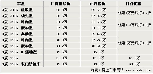 據(jù)4S店銷售人員介紹:目前寶馬3系全系車型都有一定幅度優(yōu)惠,最高降幅達(dá)到3.9萬元。雖然較之前的優(yōu)惠幅度有所減小,但是目前現(xiàn)車比較多,尤其寶馬318i系列與325i系列店內(nèi)現(xiàn)車充足,320i豪華型需預(yù)定,預(yù)訂需等1個月至2個月時(shí)間。據(jù)經(jīng)銷商介紹,寶馬318i進(jìn)取型將近停產(chǎn),所以喜歡這款車的朋友盡快到店內(nèi)訂車,目前店內(nèi)有少量現(xiàn)車顏色不全。在優(yōu)惠幅度上,寶馬318i系列在優(yōu)惠1萬元后可打9.4折,寶馬320系列兩款車型在優(yōu)惠1.3萬元后可打9.6折,325系列可優(yōu)惠2萬后再打9.6折。寶馬335i和320i雙門轎跑車無任何優(yōu)惠,預(yù)定車需等4-6個月。