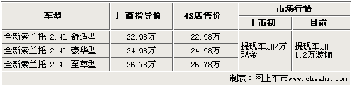 起亞進(jìn)口SUV全新索蘭托于7月29日正式上市銷售,前期推出了三款車,售價(jià)為22.98萬(wàn)——26.78萬(wàn)元。據(jù)網(wǎng)上車市價(jià)格監(jiān)測(cè)系統(tǒng)顯示:目前北京地區(qū)進(jìn)口起亞4S店內(nèi)無(wú)現(xiàn)車銷售,急于提現(xiàn)車的消費(fèi)者在店內(nèi)購(gòu)買1.2萬(wàn)元的裝飾后,即可在本周提到愛(ài)車,而預(yù)訂則需要等待一個(gè)月左右。