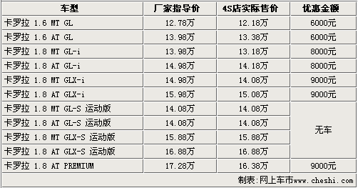 據(jù)一汽豐田4S店銷(xiāo)售人員介紹:目前2.0L排量的運(yùn)動(dòng)版車(chē)型無(wú)現(xiàn)車(chē)銷(xiāo)售,購(gòu)買(mǎi)其他車(chē)型則可以享受到8000元——9000元的現(xiàn)金優(yōu)惠。入門(mén)級(jí)的1.6 MT GL版車(chē)型售價(jià)降到了12.18萬(wàn)元,高配的1.8 AT PREMIUM版經(jīng)9000元優(yōu)惠后,售價(jià)也降到了16.38萬(wàn)元。