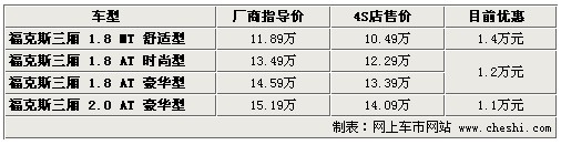 據(jù)4S店銷售人員介紹:目前福克斯三廂1.8升三款車型現(xiàn)車充足,尤其銀色、灰色、藍(lán)色、黑色車型現(xiàn)車較多,手動擋車型目前優(yōu)惠1.4萬元,優(yōu)惠后僅售10.49萬元,1.8升自動版車型優(yōu)惠1.2萬元。2.0升車型目前現(xiàn)車較少,顏色也不齊全,訂車需等待3周左右,目前優(yōu)惠1.1萬元。