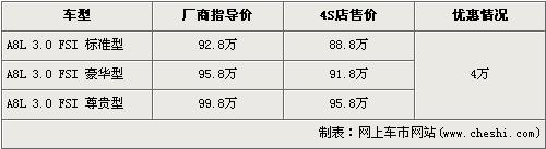 據(jù)北京奧迪經(jīng)銷店銷售人員介紹,目前奧迪A8L的3.0L車型有4萬元的優(yōu)惠。經(jīng)優(yōu)惠后,3.0L標準型的售價從92.8萬下降到了88.8萬元,3.0L豪華型的售價從95.8萬元下降到了91.8萬元,3.0L尊貴型的售價也從99.8萬元下降到了95.8萬元。銷售人員還介紹,店內(nèi)目前沒有現(xiàn)車,欲購買的消費者需交2萬元訂金,本月月底可提車。