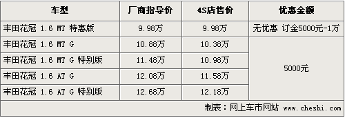 據(jù)4S店銷售人員介紹,花冠特惠版車型在配置方面比現(xiàn)在標(biāo)準(zhǔn)版有所減少,其中包括減少了遙控鑰匙、前進(jìn)氣格柵的鍍鉻裝飾條,揚聲器由4個減少為2個,其他方面并沒有明顯變化,F(xiàn)在這款車定金為5000元-1萬元,最快月底到店,10月份將全面到店。同時現(xiàn)售的車型價格方面可以優(yōu)惠5000元現(xiàn)金,但現(xiàn)車數(shù)量不多,仍需要預(yù)訂。