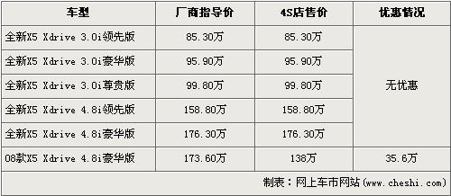 據經銷商處銷售人員介紹,店內還有一批售價為173.6萬元的08款X5 4.8i豪華版現(xiàn)車,目前此批車有35.6萬元的優(yōu)惠,經優(yōu)惠后售價降到了138萬元。銷售人員還介紹,新款的X5全系沒有現(xiàn)車,欲購買者需交訂金10萬元,約等2個月才可提車。