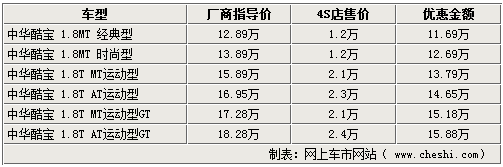 酷寶系列車型,不僅外形時尚,動力也相當(dāng)充沛,不僅可與進口跑車如蓮花競速相媲美,也帶動了自主跑車市場的競爭。近期網(wǎng)上車市網(wǎng)站了解到,隨著市場競爭的加劇,現(xiàn)在北京的中華4S店內(nèi)最高可給出24000元的現(xiàn)金優(yōu)惠,令此車型再次引起關(guān)注。具體詳情如下: