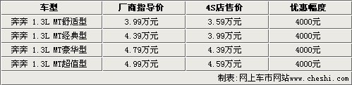 據(jù)長(zhǎng)安轎車4S店銷售人員介紹,奔奔目前現(xiàn)車都比較齊全,但與上月相比,優(yōu)惠幅度明顯有所減少。目前奔奔1.3L四款車型只能優(yōu)惠4000元,比前一段時(shí)間少了1000元。但銷售人員也表示,如果消費(fèi)者到店詳談,還可能有進(jìn)一步優(yōu)惠的余地。