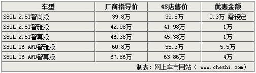 據(jù)4S店銷售人員介紹,目前國(guó)產(chǎn)S80L全系智尚版沒(méi)有現(xiàn)車供應(yīng),需要消費(fèi)者訂車,訂金為5萬(wàn)元。除優(yōu)惠5.5萬(wàn)的T6智雅版外,其它幾款車也可以分別優(yōu)惠1萬(wàn)到4萬(wàn)元不等,到店詳談還可以有更多的優(yōu)惠。