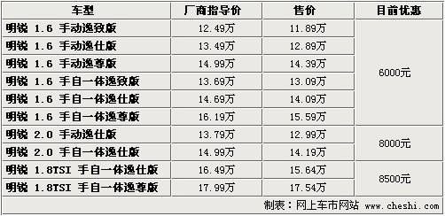 據(jù)4S店銷售人員介紹:目前明銳全系最高優(yōu)惠8500元,部分車型有現(xiàn)車,顏色包括銀色、灰色車型。如需預定需等待1個月至3個月時間。目前1.6升車型優(yōu)惠達6000元,2.0升車型優(yōu)惠仍為8000元,1.8TSI的兩款車型優(yōu)惠8500元,較之前有所縮水。如在店內(nèi)做裝飾還可打8折,雖然折后裝飾價格仍有些偏高,但產(chǎn)品質(zhì)量可以保證。